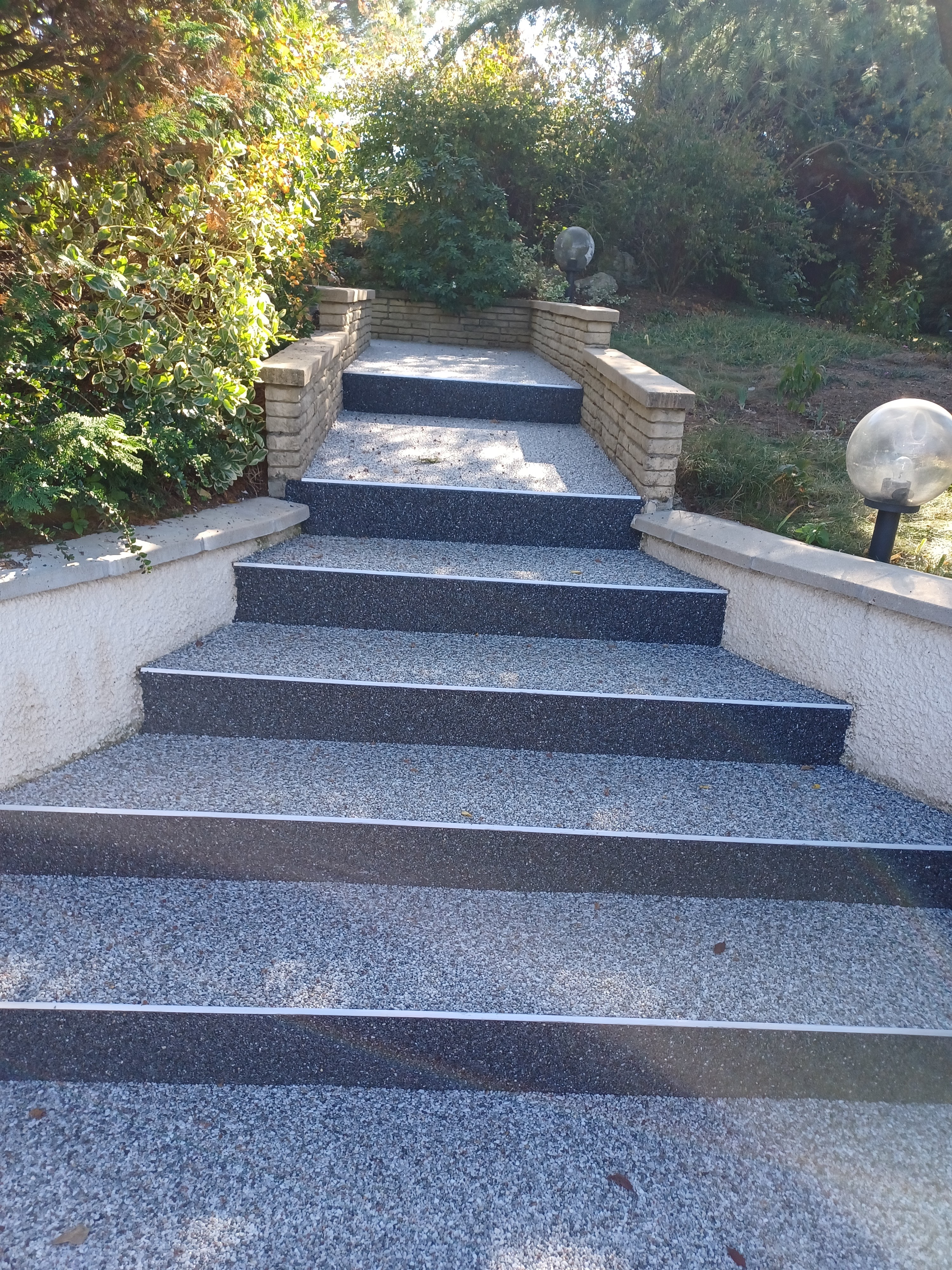 Rénovation Escalier extérieur. Démolition revêtement en carrelage. Préparation des marches et des contre-marches par ponçage. Mise en place de Nez de Marche et profils de finition en Alu Pose d'un revêtement Moquette de Pierre sur Marches et Contre-marches. Très Satisfait du travail des deux compagnons tant en qualité que du professionnalisme. Compagnons à l'écoute des remarques et souhaits émis. Chantier mené proprement. Très satisfait du résultat de ces travaux. On espère que ce travail et ce matériau résistera et durera dans le temps pour ne pas dire à vie.